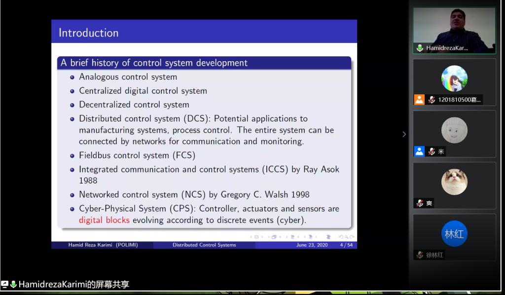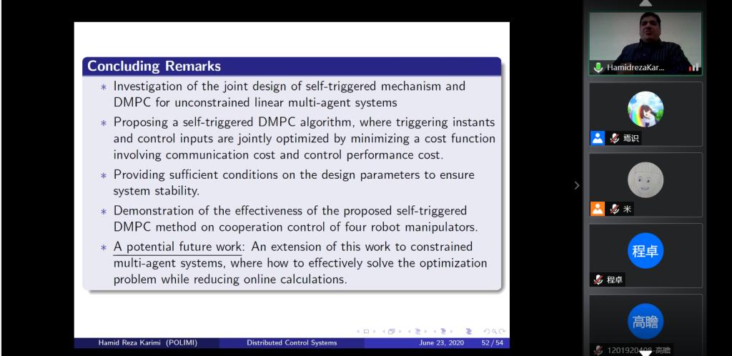 应taptap点点官方网站院长丁华锋教授邀请,意大利米兰理工大学Hamid Reza Karim教授于6月23日通过线上会议来taptap点点官网作题为Distribute Control of Mult iagent System:Theory and Applications的学术报告。报告会由葛明峰老师主持,taptap点点官网罗杰副院长、李敏、雷波、王玉丹等老师以及研究生均出席了报告会。