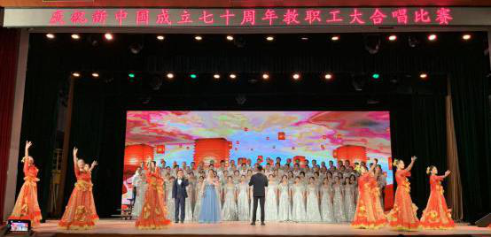 伴随着悠扬的旋律响起,领唱侯强老师及其女儿侯明,嘹亮优美的歌喉回荡在弘毅堂内。随后,舞台上近百名教职工铿锵激昂地唱出“不忘初心,继续前进;万水千山最美,中国道路!”字里行间饱含为祖国骄傲,为民族自豪的深情。为了迎接这次比赛,瞿祥华书记带领工会同事组织本院教职工,利用有限的场地进行了多次排练,合唱的老师们及领唱都怀着极大的热情参与到排练中;他们纷纷表示,这首歌唱出了自己的心声。新中国历经风雨走到今天,能探索出这样一条适合中国国情的道路是一个了不起的成就;实现中华民族的伟大复兴,需要这条道路来引领广大人民不断前进。作为教育工作者,他们一定如歌中所唱的那样,不忘初心、牢记使命,在为国培养优秀人才的教育岗位上发光发热,力争做出更大的贡献。