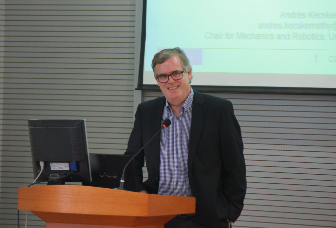 Kecskeméthy教授目前担任机构和机器科学国际顶级期刊《Mechanism and Machine Theory》主编、IFToMM(国际机器与机构科学联合会)德国主席,是德国杜伊斯堡-埃森大学机电一体化和机器人研究中心首席教授。Kecskeméthy教授在机器人运动学和动力学分析及控制领域取得了重要的理论成果,其成果在高档汽车、仿生机器人、虚拟现实和工业机器人等领域得到广泛的应用。Kecskeméthy教授带领的研究团队在机构学和机器人领域的研究处于世界领先地位,发表学术论文300余篇。