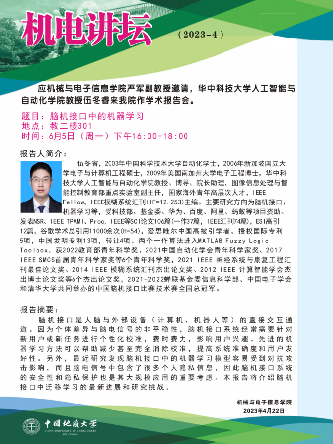 【6月5日】机电讲坛(2023-4:华中科技大学人工智能与自动化学院教授伍冬睿来taptap点点官网作学术报告会