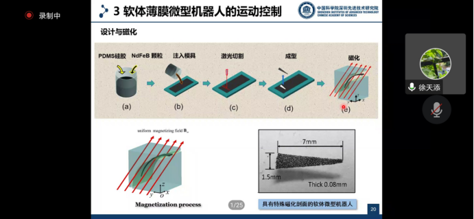 徐天添研究员在磁驱动微型机器人方向开展了长期系统性研究,通过优化设计提高了微型机器人的运动效率,解决了软体微型机器人的多模态运动问题,以“磁驱动软体薄膜微型机器人的多模态运动与协同控制”为题作交流报告,报告围绕着软体薄膜微型机器人的运动控制展开,介绍了磁驱动螺旋型微型机器人和软体薄膜微型机器人的三维路径跟踪控制,以及适应复杂环境的多模态运动机制。微型机器人如何在相同的外界磁场中做出不同的运动,并且协同作业是一项很大的挑战。单个微型机器人的异性特质是控制处在同一磁场中的多个微型机器人运动的关键。基于对软体机器人的磁化方向与运动效率的研究,设计薄膜机器人的异构磁化方向,控制不同微型机器人的速度差,以实现协同控制。最终实现四个软体薄膜微型机器人的独立位置控制,以及三个微型机器人的独立路径控制,为软体薄膜微型机器人在生物体内协同靶向治疗提供了理论基础与技术依据。