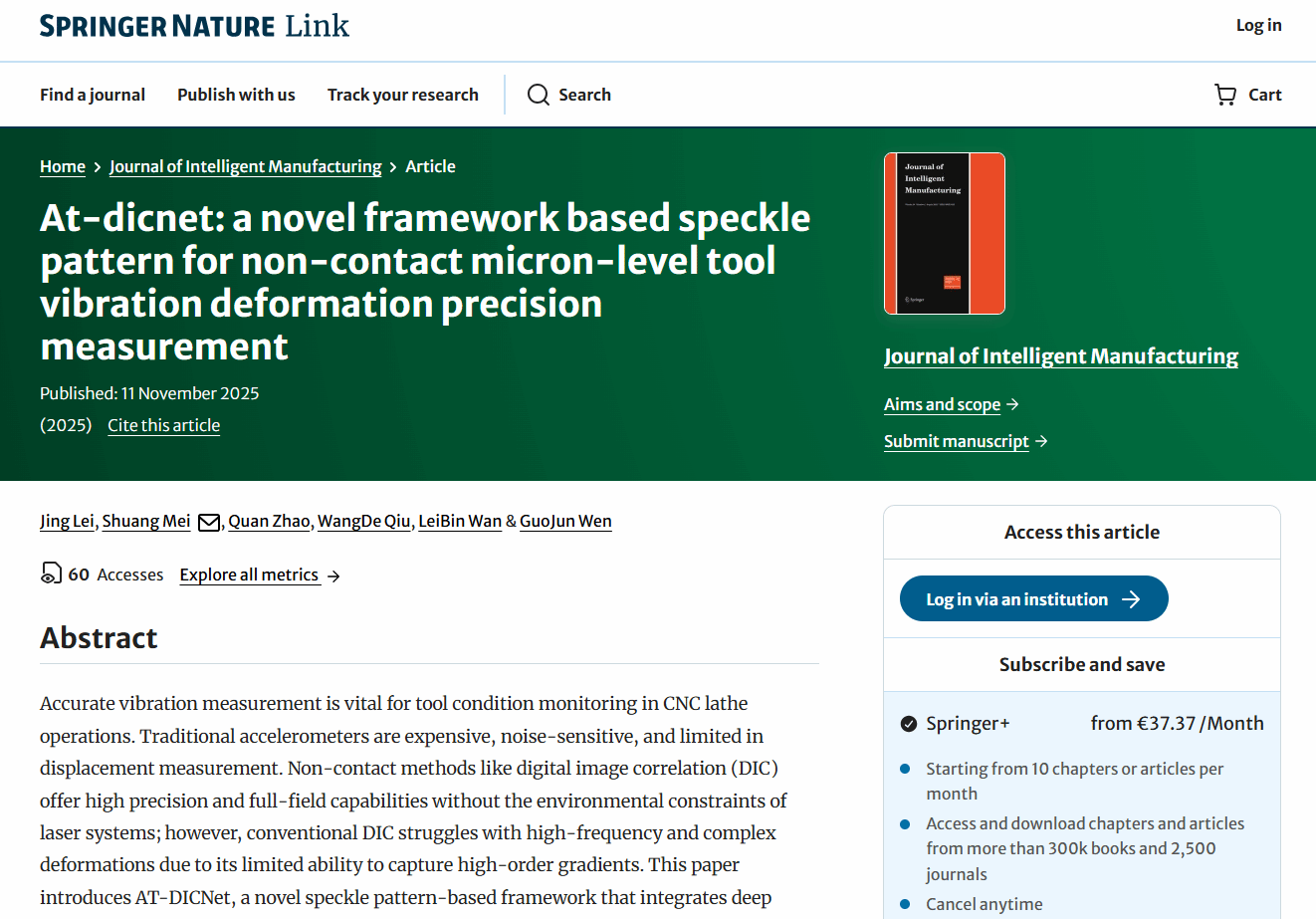 近日,taptap点点官网梅爽教授、文国军教授科研团队在制造装备监测领域取得重要进展,成功研发基于数字图像相关(DIC)的非接触式刀具振动变形高精度测量系统。相关成果“AT-DICNet: A Novel Framework based on Speckle Pattern for Non-contact Micron-level Tool Vibration Deformation Precision Measurement”发表于国际权威期刊《Journal of Intelligent Manufacturing》,该论文第一作者为2022级研究生雷靖,梅爽教授为通讯作者。
