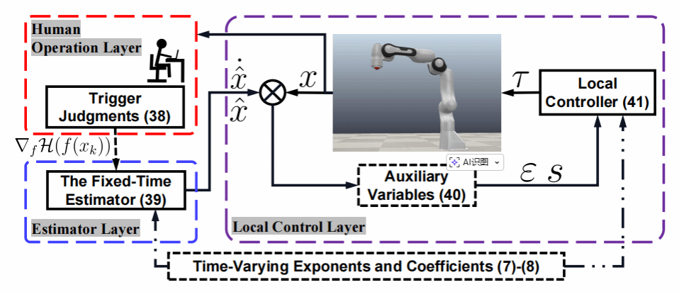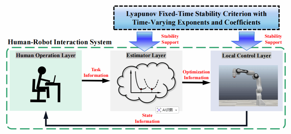 近日,taptap点点官网机电学院葛明峰教授团队(付智辉、葛明峰、丁腾飞)与华中科技大学人工智能与自动化学院刘智伟教授团队合作的最新研究成果“Task optimization for fixed-time control of intermittent human-robot interaction with time-varying exponents and coefficients”被国际主流期刊《IEEE Transactions on Cybernetics》(2026年1月26日最新影响因子10.5,最新学校分区为T1)在线发表(DOI:10.1109/TCYB.2026.3650907)。该文提出了一种分层固定时间事件触发优化(Hierarchical Fixed-Time Event-Triggered Optimization,HFTEO)算法,旨在提升人类与机器人在动态环境中协作任务的效率与安全性。随着人工智能和机器人技术的快速发展,人机协作系统在工业、医疗、服务等多个领域的应用日益广泛。传统的机器人控制系统通常依赖于精确的指令与数据输入,但在实际应用中,人类操作员的决策往往是不确定和变化的,这对机器人的稳定性和任务执行效率提出了更高的要求。传统的任务优化方法往往依赖于连续和稳定的操作环境,但实际的人机交互通常是间歇性的,且存在不确定性,例如人类操作员的反应时间延迟、意图变化以及机器人控制的响应能力等。这使得如何在不确定的交互环境中确保任务的高效完成,成为一个亟待解决的技术难题。