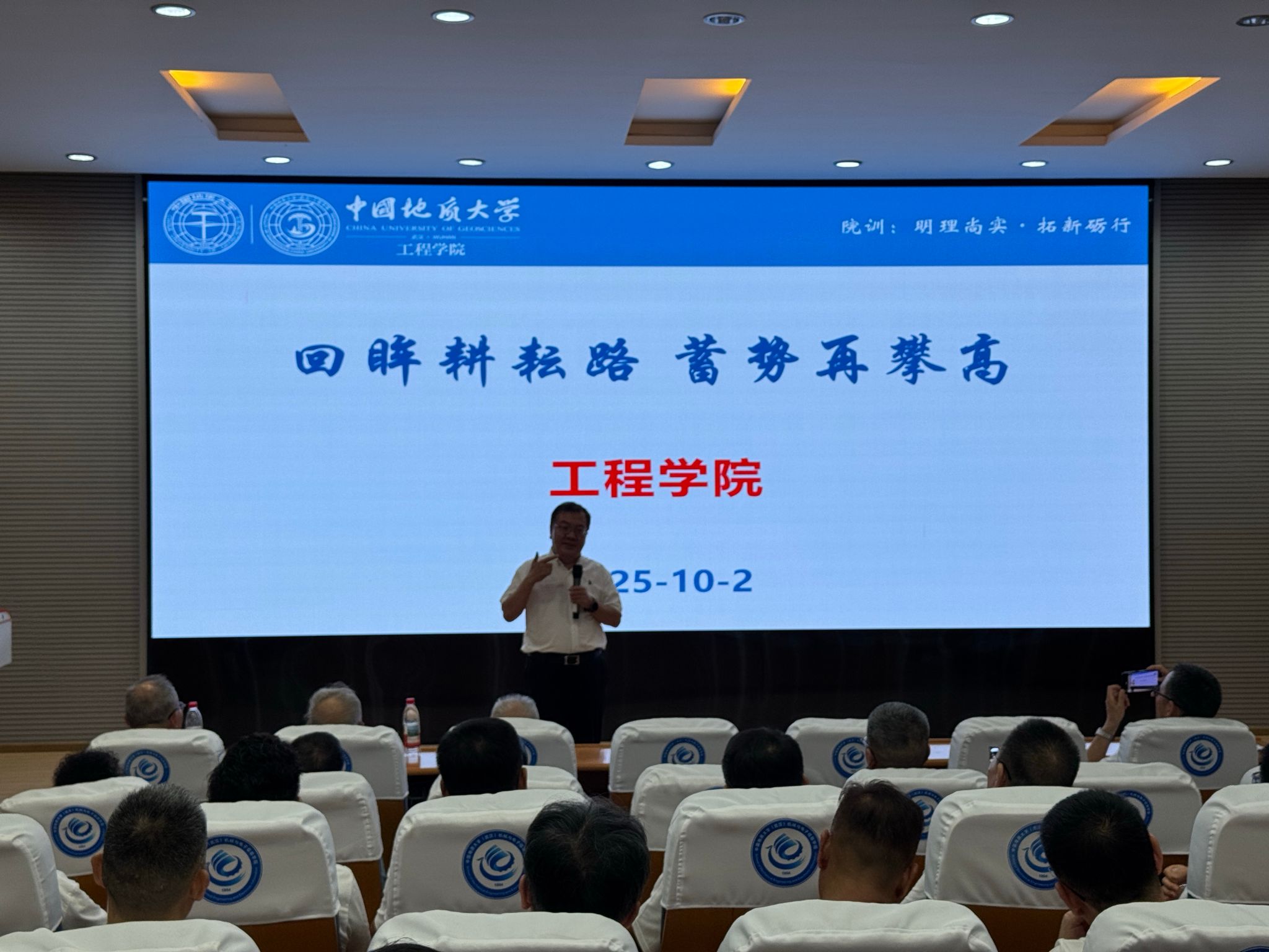 会上,工程学院院长王亮清率先详细介绍学院发展成果。他指出,探工系以机械专业为根基,在梳理历任四位院长的建设历程后,明确学院“立足地学特色、深耕工程领域”的目标定位。同时,他通过展示多类科研平台实景,全面讲解学院从本科到博士后的完整学科体系与师资队伍建设成效;结合条形图数据,直观呈现 “本科生占比高、人才培养基数大”的现状,并重点阐述学院创新构建的 “具备系统演化观、人地协调观、工程伦理观” 新工科人才培养模式。此外,王亮清院长还从党建双创、人才培养、科学研究等维度,总结 2024 年工作亮点,特别提及机电学院宁伏龙院长标志性成果“梦想号”获习近平总书记表彰的重要荣誉,充分彰显学院在科研与育人领域的卓越实力。